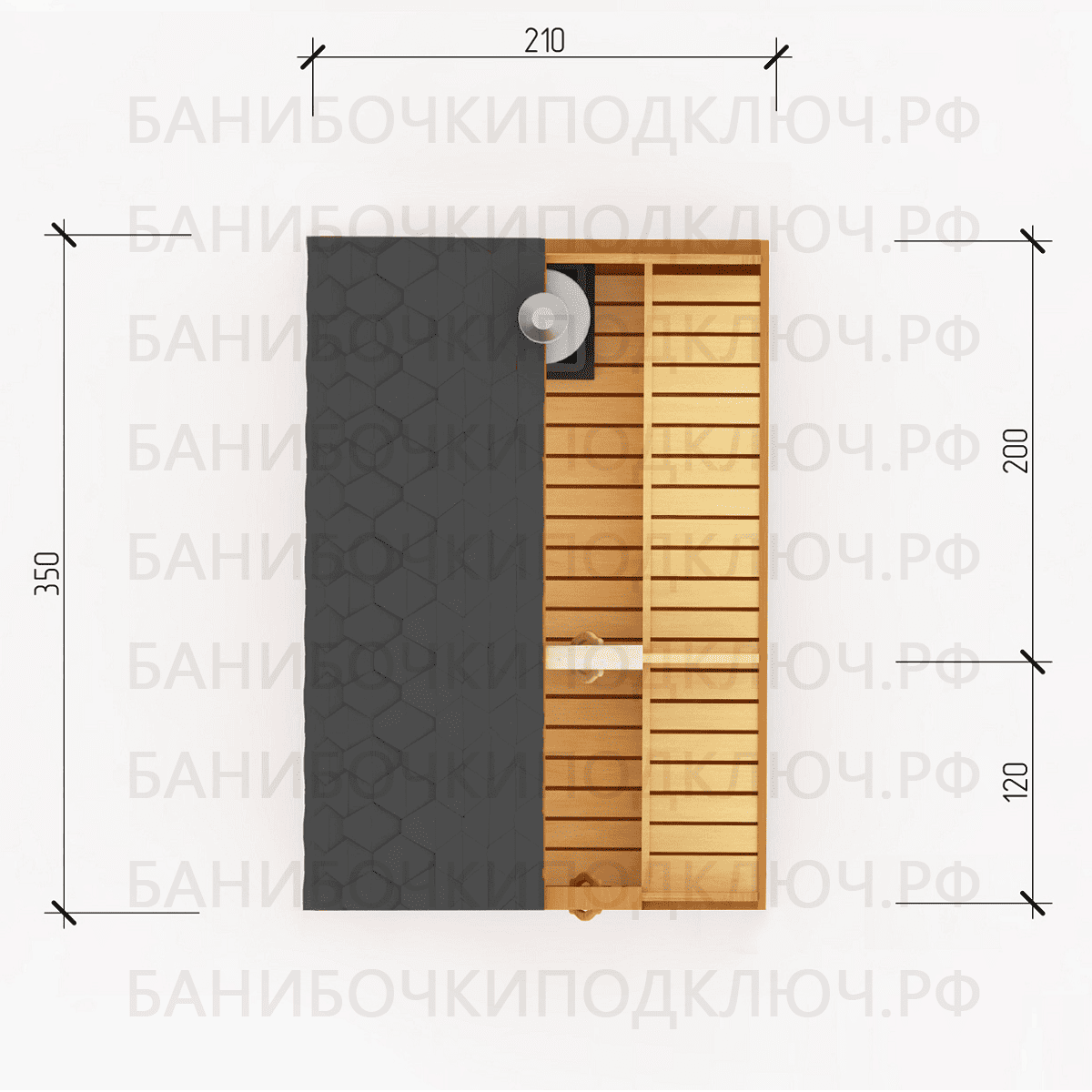 комната отдыха – 350х300, парная 220х300, мойка 120х150