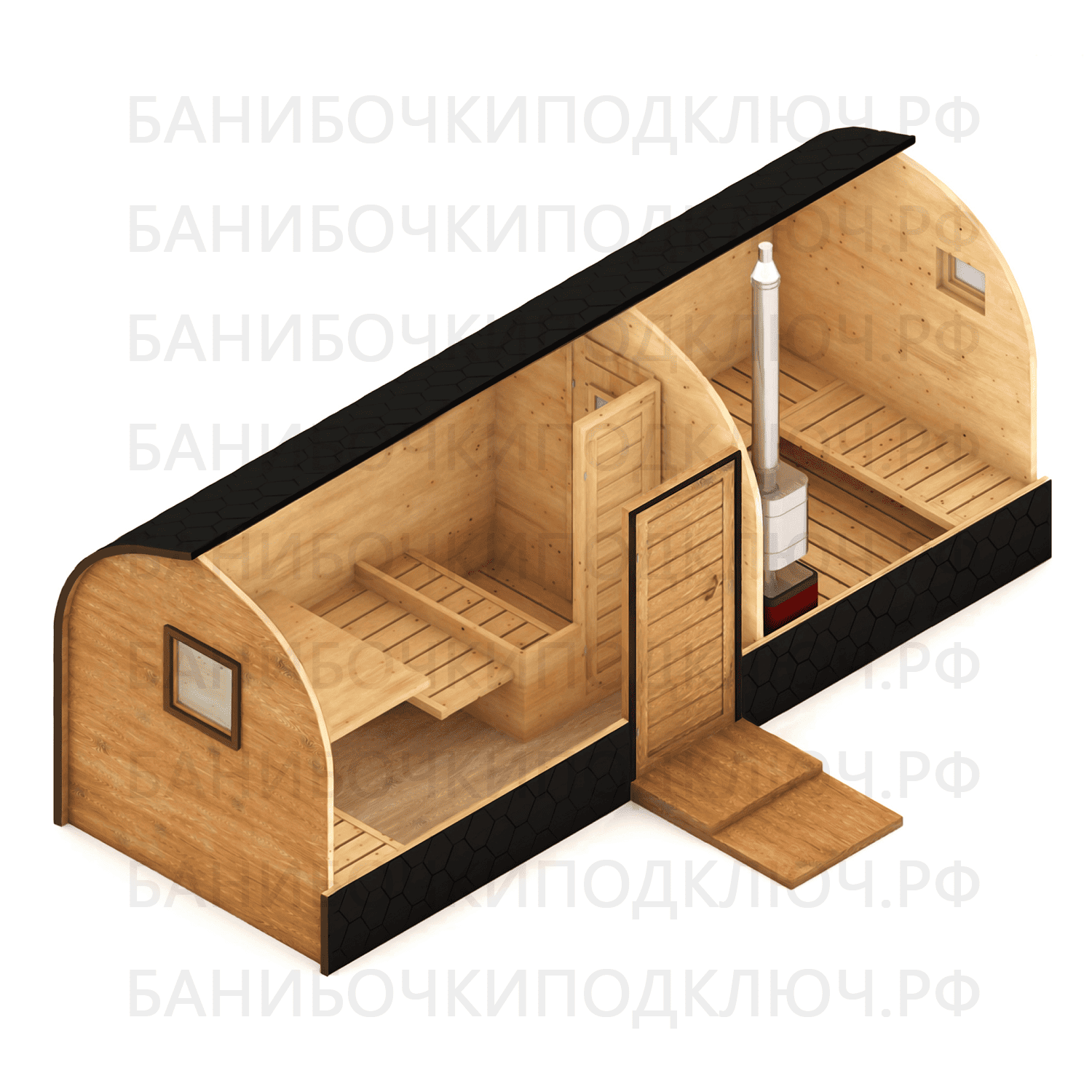 Баня Викинг 6 x 2,2 м с арочным входом и проходной мойкой